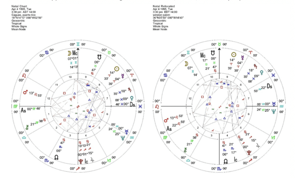 For example, you can see in this relocated chart a shift from a challenging Pluto IC placement in one location to a more favorable Sun in the ninth house in another, can significantly change one’s life. Sun is at home in the ninth house.  Although, she does not live on the most favorable paran lines, she is happy here in Winston Salem, North Carolina living with her husband who she met in South Korea while serving in the United States Army.
