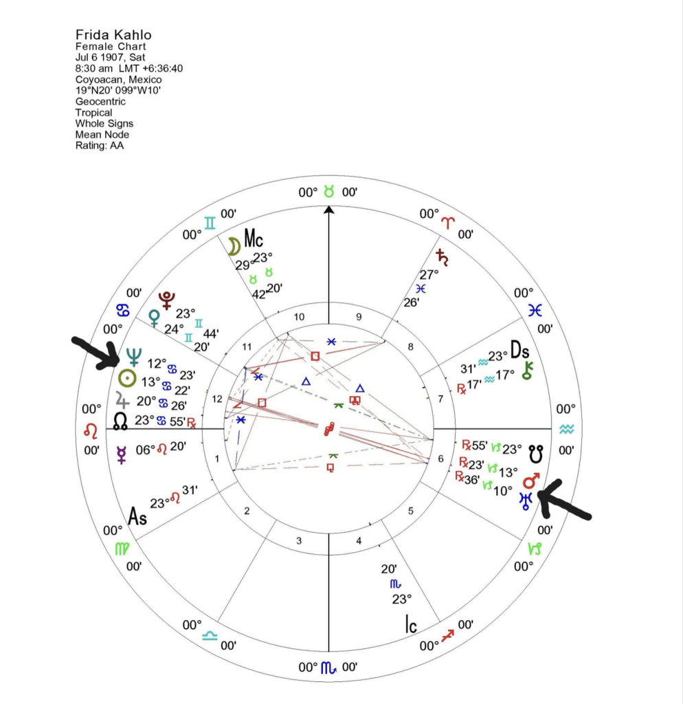 Frida also has a Sun-Neptune conjunction which fuels artistic abilities and a strong inclination toward healing or helping others.